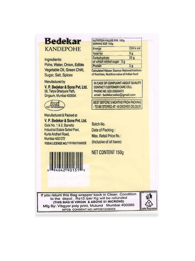 Ingredients : Pohe, Water, Onion, Edible Vegetable Oil, Green Chilli, Sugar, Salt, Spices