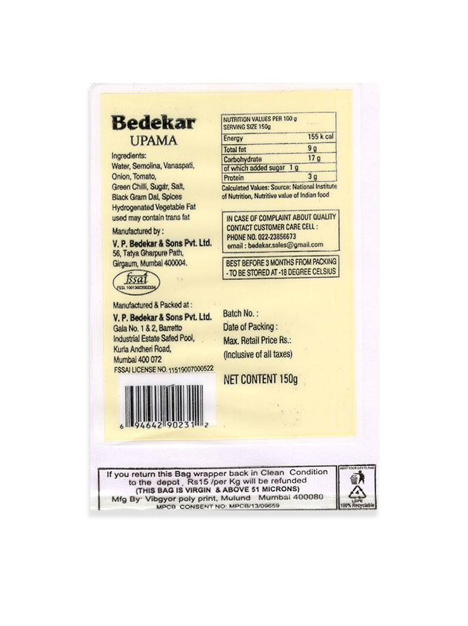 Ingredients : Water, Semolina, Hydrogenated Vegetable Fat, Onion, Tomato, Green Chilli, Sugar, Salt, Black Gram Dal, Spices